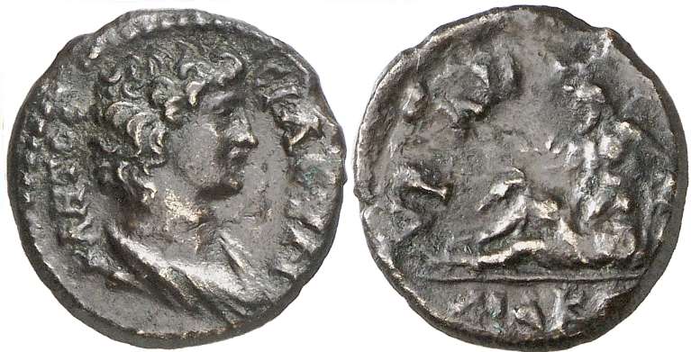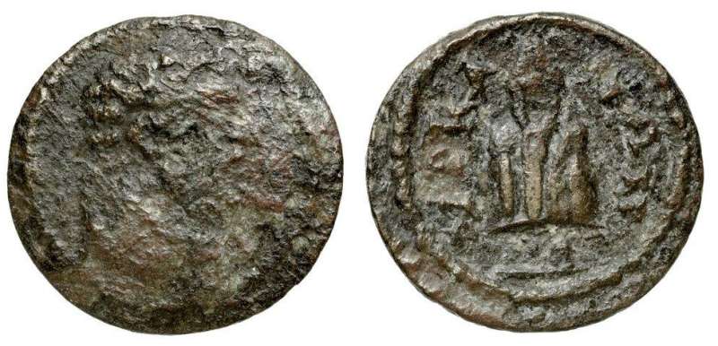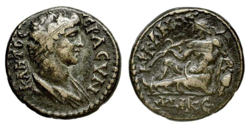 | Hunter 585 | Hadrian AE20 of Hyrkanis, Lydia. AD 117-138. Magistrate Marcus Peducaeus Priscinus. AY KAI AΔΡIANOC, laureate, draped bust right / ANΘ ΠΡICKINΩ YΡKANΩN, Dionysos standing facing, looking left, holding thyrsos and kantharos. Hunter 585; RPC III 1956; Schulten 1989, 337; GRPC Lydia 35. | Text | Image |