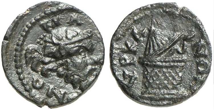 | BMC 14 | Trajan AE20 of Hyrkanis, Lydia. 98-117. Magistrate M. Quintianus. AY NEΡ TΡAIA CE ΓE ΔA, laureate head right / YΡKANΩN CTΡ M BE KYINTIANOY, Dionysos, naked but for chlamys over shoulder and lower limbs, standing left, holding kantharos and thyrsos. BMC 14; Waddington 5041; Paris 556; RPC III 1949; GRPC Lydia 29. | Text | Image |