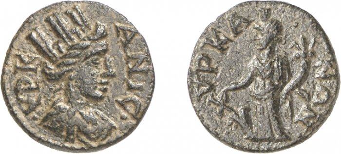 | SNG Cop 208 | Hyrkanis, Lydia, pseudo-autonomous issue, 3rd century AD. 2.95 g. YΡKANIC, turreted, draped bust of Tyche right / YΡKANΩN, Tyche standing left, holding rudder and cornucopiae. SNG Cop 208; GRPC Lydia 21. | Text | Image |