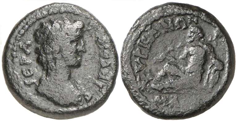 | GRPC Lydia 57 | Julia Domna, AE23 of Hyrkanis, Lydia. Strategos Lucius. IOYΛIA dot CEBACTH, draped bust right / EΠI CTΡ ΛOYKIOY, YΡKANΩN below, Hades in galloping biga right, carrying off Persephone who is raising both arms. GRPC Lydia 57, otherwise unpublished. Aiello collection 63. | Text | Image |