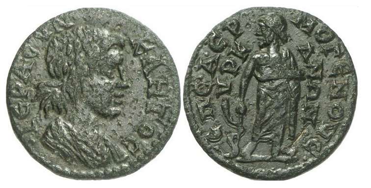 | BMC 10 | Hyrkanis, Lydia, semi-autonomous AE22. 244-249. Magistrate Au. Hermogenos. IEΡA CYNKΛHTOC, draped bust of the Senate right / EΠI A EΡMOΓENOYC YΡKANΩN, Asklepios standing front, head left, leaning on serpent-entwined staff. BMC 10 corr. (obv. description, drapery mistaken for lionskin); Mionnet IV, 326; SNG Munich 176; GRPC Lydia 24. | Text | Image |