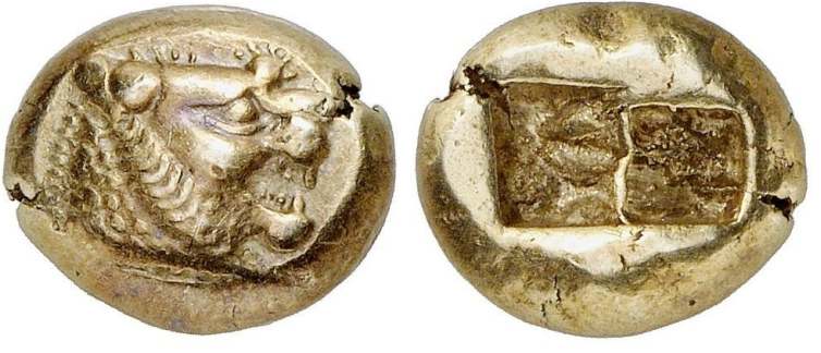 | Weidauer 89 | Lydia, Time of Alyattes 610-561 BC, EL Third Stater. Head of roaring lion right / double incuse punch. SNG v. Aulock 2868; Waggoner, Rosen Coll. 656; Weidauer 89.