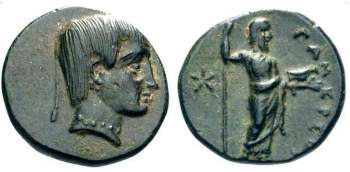 | Schultz pp 113-116 | Gamerses, Lydian dynasts, AE 0.82 gr. 400-375 BC. Youthful head right, with earring, neckband and braided strand hanging down behind head / ΓAMEΡΣOY, Zeus standing right, holding eagle and sceptre, star in left field. Schultz pp 113-116 in SM 42 (1992). | Text | Image |