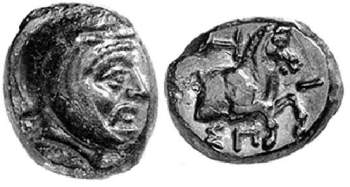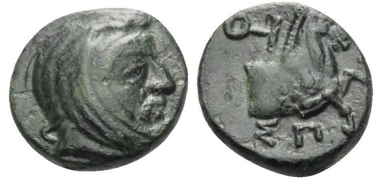 | SNG Cop 1538 | Spithridates, Satrap of Lydia and Ionia. Ca 334 BC. AE10. Head of satrap right wearing Persian headdress / ΣΠI (anticlockwise from below), forepart of horse right; OT monogram in upper left field. Babelon, Perses, 380; SNG von Aulock 1823, Klein 367. | Text | Image |