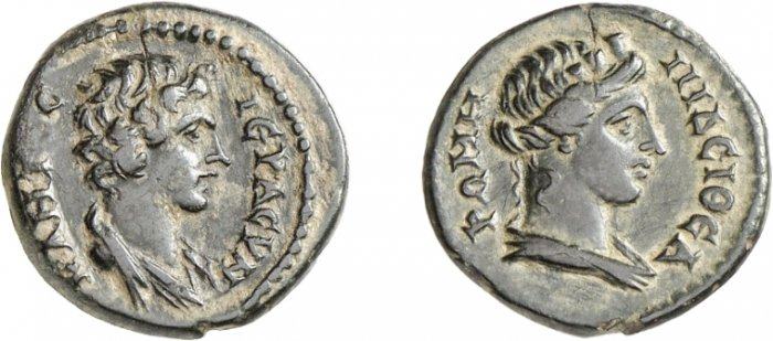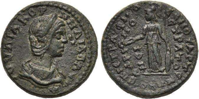 | SNG vA 3188 | Julia Paula, AE27 of Stratonikeia, Lydia (Augusta, 219-220). 16.6 gr. IOYΛIA KOΡNHΛIA ΠAYΛA, diademed and draped bust right / EΠI CTΡA ΦIΛOXENOY AΡTEMΩNO AΔΡIANO CTΡATONEI in two circles around, Athena standing left, holding patera and spear, resting left hand on shield. SNG v. Aulock 3188; Imhoof GM 627; GRPC Lydia 40. | Text | Image |
