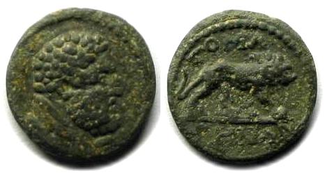 | GRPC Lydia 6 | Tomaris, Lydia, 2nd -3rd Century AD. ΔHMOC, unbearded head of Demos right, hair bound with taenia / TOMAΡHNΩN (HN ligate), eagle standing facing, head left. Righetti Coll. IV, 889; Kurth Demos 638; GRPC Lydia 6. | Text | Image |