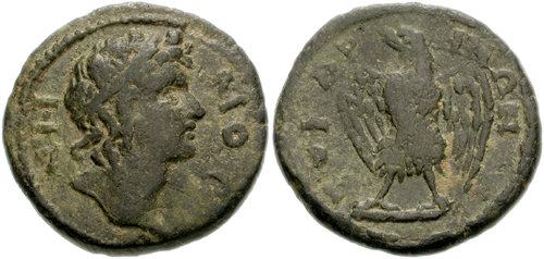 | Imhoof LS 4 | Tomaris, Lydia, AE15 semi-autonomous issue, AD 193-244. Bearded head of Herakles right / TOMAΡHNΩN, eagle standing facing, head right, wings spread. Imhoof LS 4; Imhoof GM 641; SNG Turkey 7, 430; GRPC Lydia 8. | Text | Image |