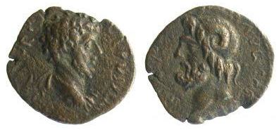 Mionnet 358 | Lucius Verus, AE22 of Cassandrea, Macedonia. L AVR VERVS, bare-headed, draped and cuirassed bust right / COL IVL AVG CAS, head of Zeus Ammon left. Paris 605; Mionnet Supp. III, 358; Varbanov 3342. | Text | Image |
