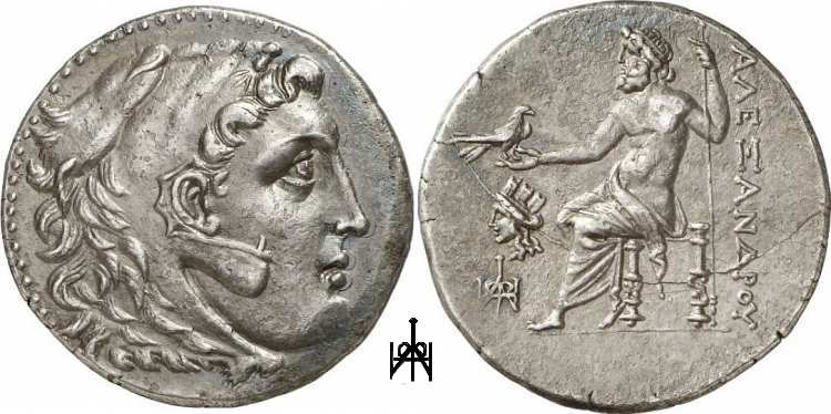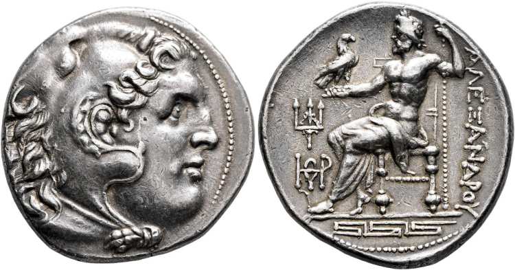 Text Image Price 3633 Alexander III, AR tetradrachm, Babylon mint. 24 mm, 17.12 g. Lifetime issue, 336-323 BC. Head of Herakles right, wearing lionskin headdress. / AΛEΞANΔΡOY, Zeus seated left, holding eagle and sceptre. Trident head left in left field. IΦΛI monogram over M beneath chair. Price 3633; Demanhur hoard 4228-4230; Newell, 'Reattribution' 213. Text Image Price 3634 Alexander III AR Tetradrachm. Babylon mint. Struck 325-323 BC. Head of Herakles right, in lionskin headdress / AΛEΞANΔΡOY, Zeus seated left, holding eagle and sceptre; IΦΛI monogram over M beneath chair, trident head in ex.