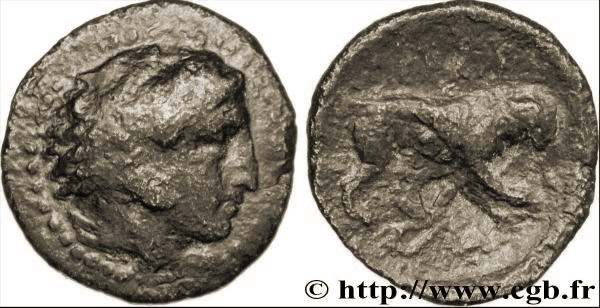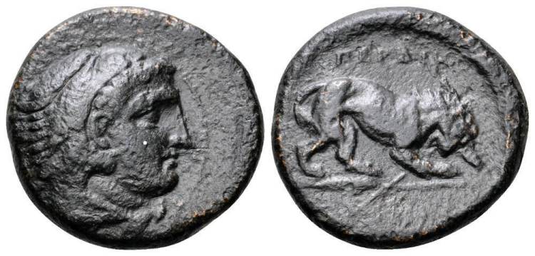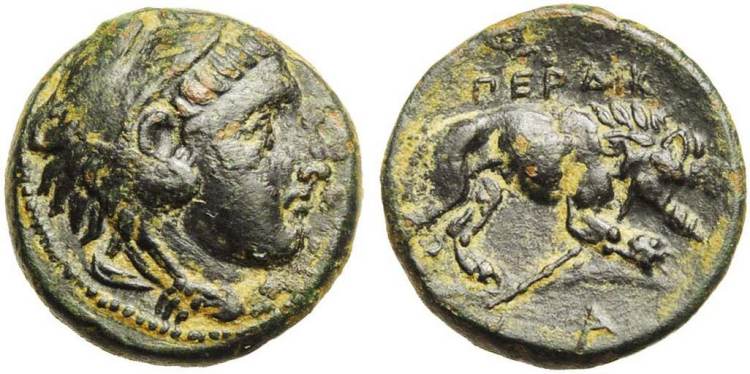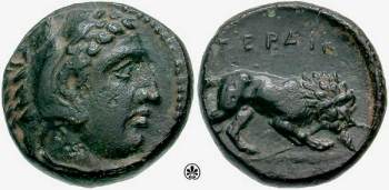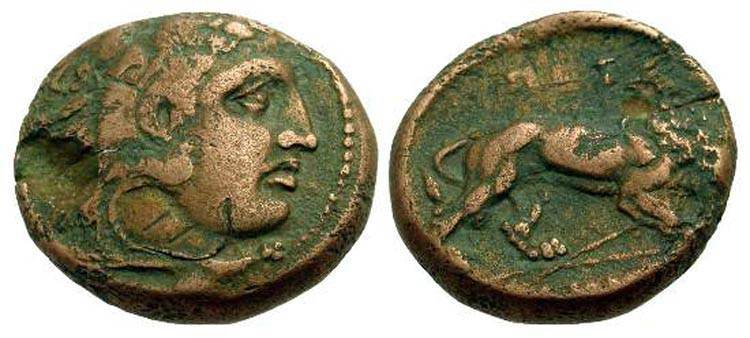 | Sear SG 1515 | Kingdom of Macedonia, Perdikkas III AE16. Head of Herakles right clad in lion's skin / ΠEΡΔIK-KA above and beneath lion walking right holding a broken spear in its jaws. | Text | Image |