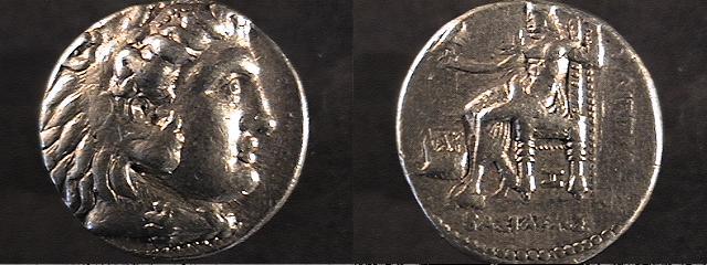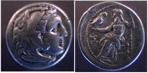 | Price P186 | Kingdom of Macedonia, Philip III AR Tetradrachm. Babylon mint, circa 323-317 BC. Head of Herakles right, in lionskin headdress / Zeus seated left, holding eagle and sceptre; M before; monogram beneath throne above strut. Müller P104. | Text | Image | Text | Image |