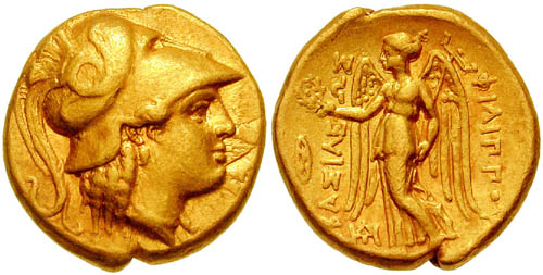 | Price P203 | Kingdom of Macedon, Philip III AV Stater. 323-317 BC. Babylon mint. Head of Athena right, in crested Corinthian helmet decorated with a griffin / BAΣIΛEΩΣ ΦIΛIΠΠOY, Nike standing left, holding wreath in right hand, stylis in left; below left wing, facing head of Helios; KY below right wing. Müller P116. | Text | Image |