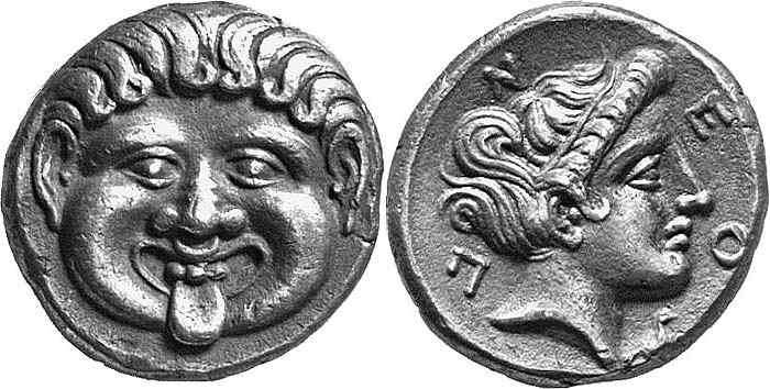 | SNG ANS 449cf | Neapolis, Macedonia, 5th-4th Century BC, AR Hemidrachm. Head of gorgoneion facing, tongue protruding / laureate head of Artemis Parthenos right. | Text | Image |