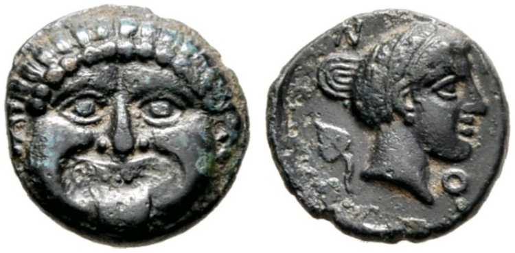 | SNG Cop 231 | Neapolis, Macedonia. AE unit, ca. 420-350 BC. Head of gorgoneion facing, tongue protruding. / N-E-O, head of nymph right, hair rolled behind her head. Ivy leaf in left field. SNG Cop 231. | Text | Image |