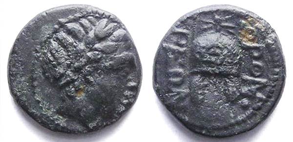 | BMC 6 | Orthagoreia. c350 BC. Orthagoreia, Macedonia, AE14. Laureate head of Apollo right / OΡΘAΓ-OΡEIΩN, Macedonian helmet surmounted by star. Sear SG 1437, BMC 6-8. | Text | Image |