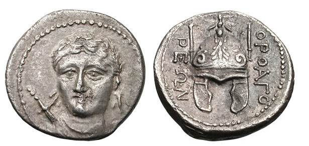 | SNG ANS 562 | Orthagoreia. c350 BC. AR Stater. Head of Artemis right, quiver over shoulder / OΡΘAΓOΡEΩN, crested Macedonian helmet with cheek flaps surmounted by star; HG monogram below. | Text | Image |
