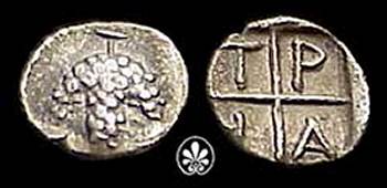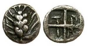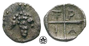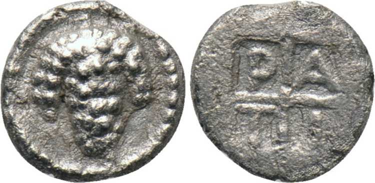 | Moushmov 6892 | Macedon, Tragilos. Circa 450-410 BC. AR Hemiobol. Grape bunch / T-Ρ-I-A within quadripartite incuse square. SNG Cop 447. | Text | Image | Text | Image | Text | Image |