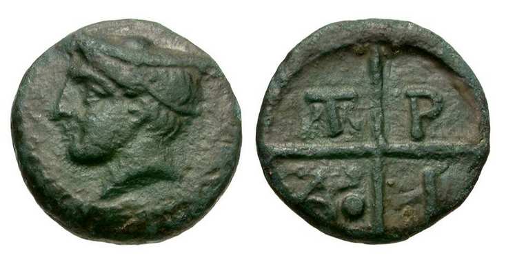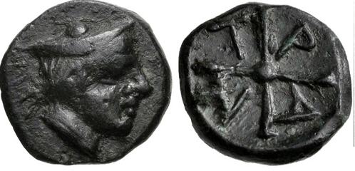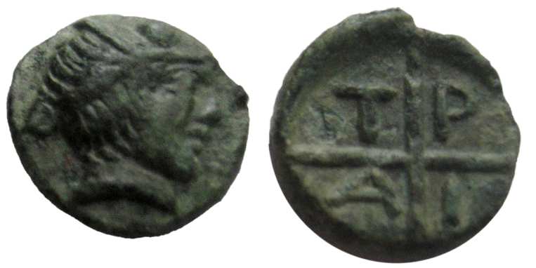 | BMC 9 var | Tragilos, Macedonia, AE9. ca 400-380 BC. 1.2 g. Head of Hermes right, wearing petasos. / T-Ρ-A-I in the four corners of a quadripartite incuse square. BMC 9 var (position of A and I; Hunter -; AMNG -; Weber -; Traité -. | Text | Image |