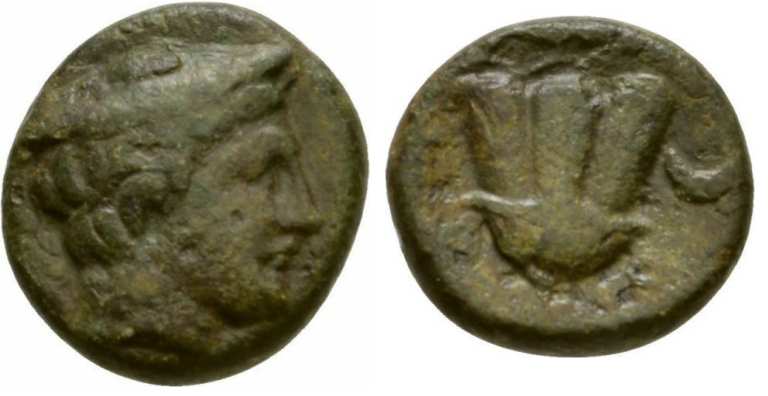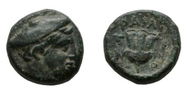 | BMC 14 | Tragilos as Traelium, Macedonia, AE15 Dichalkon, civic issue. ca 400-380 BC. 4.48 g. Head of Hermes right, wearing petasos. / TΡAIΛIΩN, rose, grain-ear in right field. BMC 14; Mionnet Supp. III, 1119. | Text | Image |