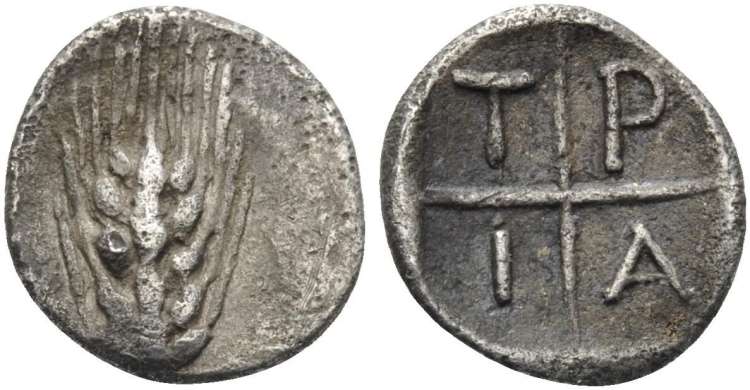 | Tragilos, Macedonia, AR Hemiobol. Ear of corn / T-Ρ-I-A in the quarters of an incuse square. Hoover HGC 745; SNG ANS 903; Sear Greek 1470. | Text | Image | |
