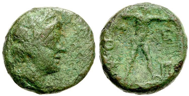 | BMC 28 | Messene, Messenia, AE17 trichalkon. 180-150 BC. 3.28 g. Head of Demeter right, wreathed with corn / M-E to left and right of Zeus striding right, brandishing thunderbolt, holding eagle on left hand, tripod in right field, O over star in left field. BMC 28; Grandjean 584a (this coin); BCD 739.1. | Text | Image |
