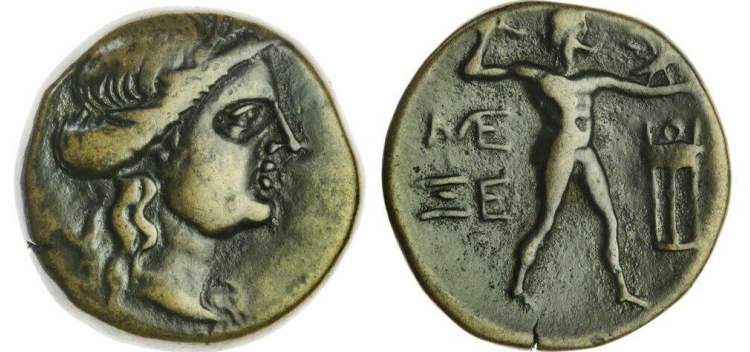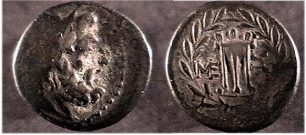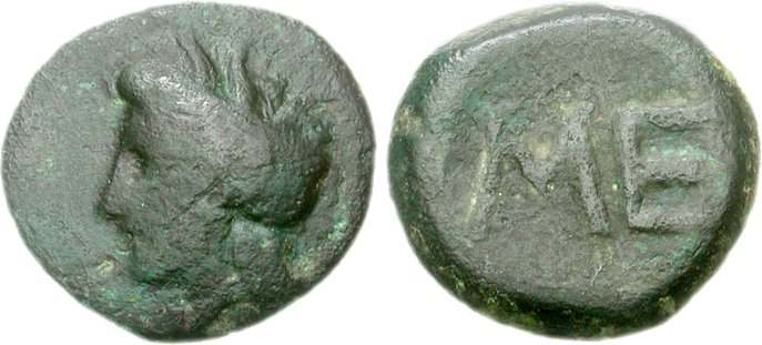 | BMC 41 | Messene, Messenia, AE12 Chalkous. ca 35 BC. 1.96 g. Laureate head of Zeus right / M-E to left and right of tripod. BMC 41; Mionnet II, 26; Grandjean 657b (this coin); BCD Peloponnesos 757. | Text | Image |