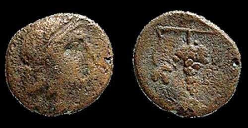 | BMC 39 | Messenia, Messene, after 281 BC. AE17mm. Head of Demeter right / Bunch of grapes on stalk with leaves; monogram and symbol to right. SNG Cop. 523-524; BMC 39-40. | Text | Image |