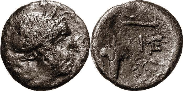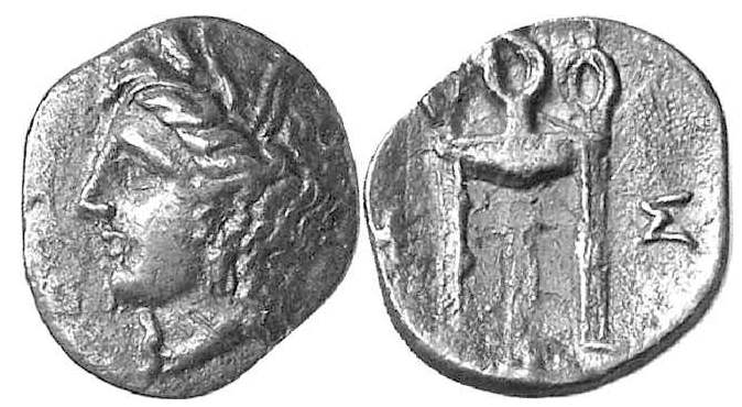 | Sear SG 2847 | Messene, Messenia. AR Obol, 0.78 g. ca. 369-330 BC. Head of Demeter left, wearing wreath of corn and pendant earring. / ME-Σ (ME ligate), Tripod. BMC 2; Grandjean 5b (this coin); SNG Cop 496; Philipsen 1324; Sear SG 2847. | Text | Image |