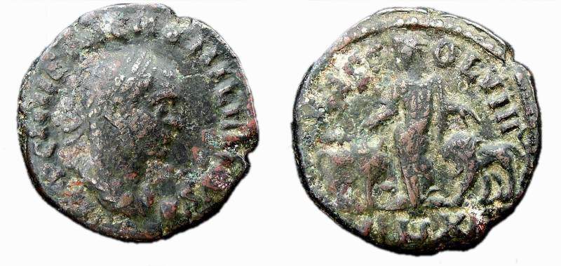 | Pick 194 | Gallienus AE25 Sestertius, Viminacium, Moesia. IMP C GALLENVS AVG, laureate, draped, cuirassed bust right, seen from the back / PMS C-OL VIM, Moesia standing facing, head left, holding hands outstretched over a lion and a bull. Year mark AN XVI in ex. Pick 194; Martin 7.15.1; AMNG 194. | Text | ![]() |