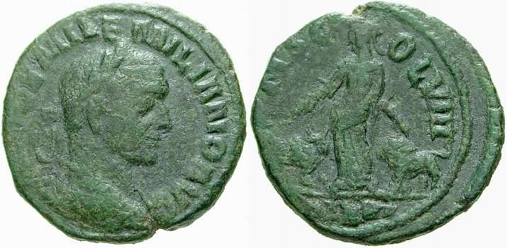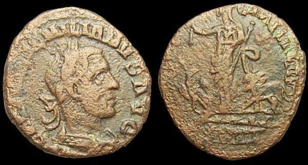 | AMNG 175 | Volusian, AE24 of Viminacium, Moesia. IMP CAE C VIB VOLVSIANO AVG, laureate, draped, cuirassed bust right / PMS-COL VIM, Moesia standing facing, head left, arms outstretched over a lion and a bull. AN XIII in exergue. AMNG 175; Martin 5.26.3. | Text | ![]() |