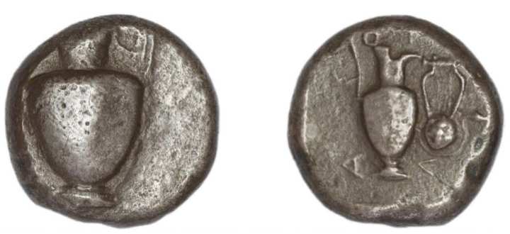 | BMC 1 | Astyra, Mysia, AR stater, 500-480 BC. 19 mm, 9.68 g. Amphora. / AΣTY around oinochoe with lyre to right, the resonator surrounded by a curved branch. BMC 1; Stauber Adramytteion 1A; Babelon Traite II-1 727. | Text | Image |