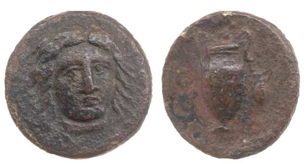 | BM 9 | Astyra, Mysia, AE19, 400-300 BC. 5.37 g. Head of Apollo or Helios facing with waved hair. / AΣTY, amphora with small oinochoe in right field. BMC 9; Stauber Adramytteion 6A-6B; Babelon Traite II-1 1617. | Text | Image |
