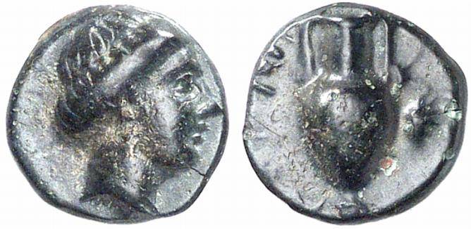 | BMC 12 | Astyra, Mysia, AE unit, 400-300 BC. 1.17 g. Head of Aphrodite (?) right, wearing sphendone, earring and necklace / AΣTY, amphora, bunch of grapes in right field. BMC 12-13; Stauber Adramytteion 14A-14C; Babelon Traité II-1, 1620; Philipsen 2303. | Text | Image |