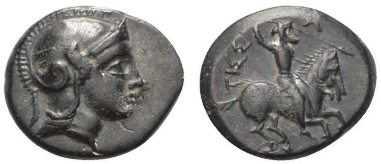 | Klein 255 | Astyra, Mysia, AE11, struck under satrap Tissaphernes, ca. 400-395 BC. 1.15 g. Head of Athena right / TIΣΣA, Horseman on horseback galloping right, holding spear in raised right hand. Winzer 6,3; Klein 255. | Text | Image |