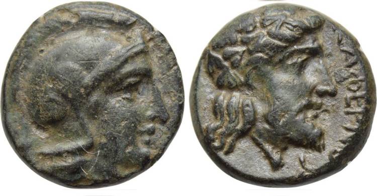 | Stauber Type C | Astyra, Mysia, AE11, struck under satrap Tissaphernes, ca. 400-395 BC. 1.62 g. Helmeted head of Athena right / TIΣΣAΦEΡNOY, head of Dionysos right, wreathed with ivy. Stauber Adramytteion type C; Winzer 6.1; Plankenhorn, Mysien 32. | Text | Image |