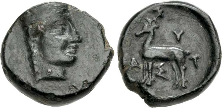 | wwxls BC11349 | Astyra, Mysia. AE9, 400-300 BC. 0.81 g. Female head right, wearing polos, hair in single braid. / A-Σ-T-Y anti-clockwise from left, stag standing left. Unpublished. wwxls BC11349; CNG 565, 74. | Text | Image |