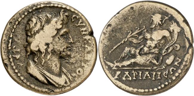 | Mionnet 225 | Caracalla, AE of Hadrianeia, Mysia. 28.02 g. AVK KAI M AVΡ ANTΩNEINOC, laureate, draped, cuirassed bust right / EΠI..MHΛANΔΡΩN KΛEIAN AΡX AΔΡIANEΩN, River god Rhyndakos reclining right beneath tree, holding reed and resting arm on overturned urn from which water flows. Before him, Hermes standing facing, head left, holding purse and caduceus, ram at foot. Mionnet Supp. 5, 225. | Text | Image |