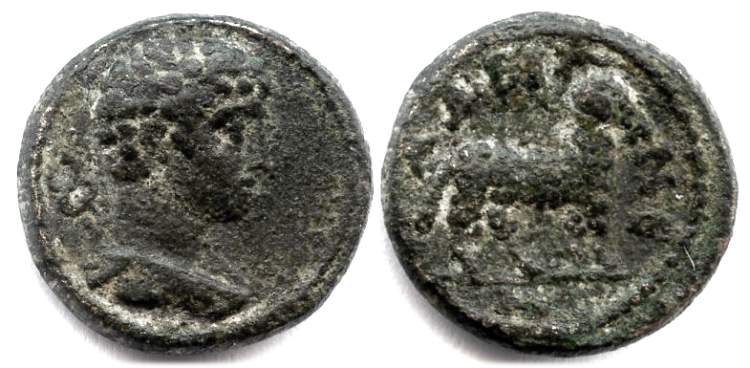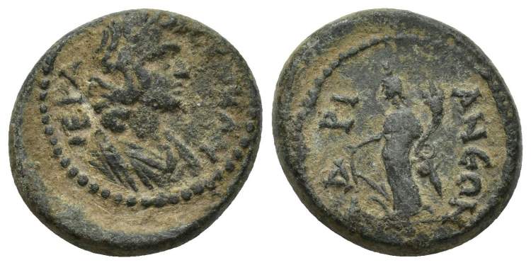 | SNG vA 1133 | Lucilla, AE19 of Hadrianeia, Mysia. AD 164-169. 18.21 mm, 2.72 g. ΛOYKIΛΛA CEBACTH, draped bust right. / AΔΡIANEΩN, Athena standing left, holding patera, resting arm on shield, spear behind her. SNG von Aulock 1133; Fritze Mysien 453; Rhousopoulos 3309; SNG Verona 1437. | Text | Image |