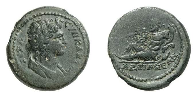 | SNG vA 1136 | Julia Domna, AE of Hadrianeia, Mysia. 5.82 g. IOYΛIA ΔOMNA, draped bust right / AΔΡIANEITΩN, bearded river god Rhyndacus, reclining left, holding reed and cornucopiae, resting on overturned urn, from which water flows. SNG von Aulock 1136 (same dies); SNG BN 1042; Lindgren 253 (this coin). | Text | Image |