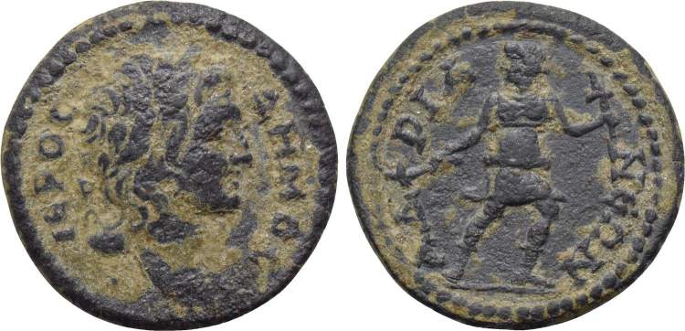 | Fritze 521 | Septimius Severus, AE35 of Hadriani ad Olympum, Mysia. AD 193-211. AY K Λ CE CEOYHΡOC ΠE, laureate, draped and cuirassed bust right / AΔΡIANΩN ΠΡOC OΛYMΠON beneath and around Apollo, naked, standing right, holding lyre on a serpent-entwined tripod, column surmounted by Artemis standing right, holding bow and reaching for an arrow. Fritze Mysien 521; Mionnet II 115; Mionnet Supp. V 219. | Text | Image |