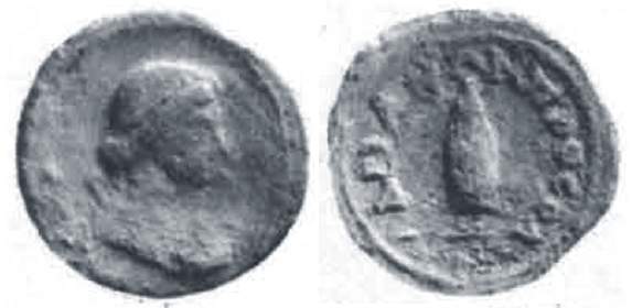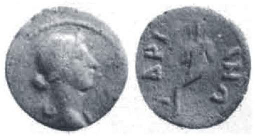 | BMC 2 | Hadrianeia ad Rhyndakos, Mysia. AE. 4.48 g. 2 c. BC. IEΡA CYNKΛHTOC, Draped bust of Senate right / AΔΡIANEΩN, bearded river god Rhyndacus, reclining left, holding reed and cornucopiae, resting on overturned urn, from which water flows. SNG von Aulock 1126. SNG BN 1028; BMC 2. | Text | Image |