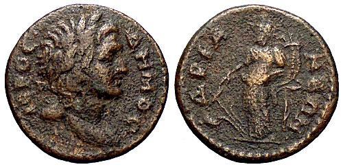 | SNG vA 1131 | Hadrianeia, Mysia, semi-autonomous AE18, Time of Septimius Severus, 193-210 AD. IEΡOC ΔHMOC, unbearded, laureate head of Demos right/ AΔΡIANEΩN, Tyche with kalathos standing left, holding rudder and cornucopiae. SNG von Aulock 1131; Fritze Mysien 444; SNG Cop. 167; Kurth Demos 854. | Text | Image |