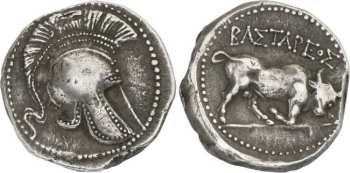 | AMNG III, 16 | Bastareus, king of Paeonia, AR tetradrachm, ca 400 BC. 13.14 g. Large crested helmet right in border of dots. / BAΣTAΡEOΣ above bull butting right, head facing, in border of dots. Paris 20; AMNG III, 16; Allatini coll. 232; Head HN p. 237 (this coin); Svoronos, HPM, pl. XIX, 2. Note: Beware of modern Bulgarian fakes (see below)! Compare the small details, especially of the helmet crest and ear flap. | Text | Image |