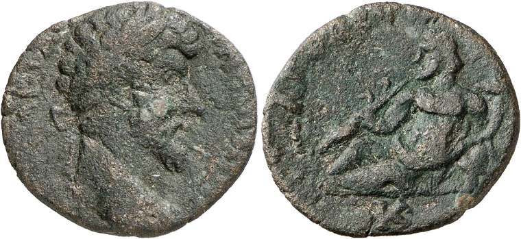 Lindgren 643 | Geta. AE of Magydos, Pamphylia. AD 161-169. 8.96 g. ΠE CEΠ ΓETAC CE, bare-headed, draped bust right / MAΓYΔEΩN, river-god Katarrhaktes reclining left, holding reed, resting left arm on overturned urn, date KΓ below. Lindgren I 643; Falter 575. | Text | Image |
