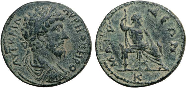 SNG vA 8509 | Lucius Verus. AE33 of Magydus, Pamphylia. 21.67 g. AD 161-169. Dated Year K. AVT K AI AVΡH OVHΡOC, laureate, draped and cuirassed bust right / MAΓYΔEΩN, Zeus seated right, holding sceptre, K below. SNG von Aulock 8509; Boston MFA 63-249; Burdur Museum 1660. | Text | Image |