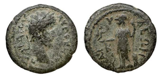 RPC III 2684 | Hadrian AE19 of Magydus, Pamphylia. AD 117-138. 4.62 g. (from top right) AΔΡIANOC KAIC, laureate, draped bust right / MAΓYΔEΩN, Athena standing left, holding Nike and spear, shield at feet; IZ (year 17) in left field. RPC III 2684; Ünal (Congress 2017), 10; Athens A-FHW-12-23. (date var of SNG France 303 var, Paris 235 and Waddington 3301). | Text | Image |