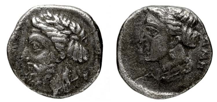 | RecGen 2 | Sesamos, Paphlagonia, AR diobol or hemidrachm, 14 mm, 1.65 g. 400-300 BC. Laureate head of Zeus left. / ΣHΣAMH, head of Demeter left, wreathed with corn, wearing earring and necklace. RecGen 2; Waddington 163; Paris F1156; Sear SG 3684. | Text | Image |