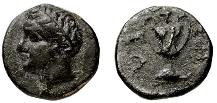 | RecGen 5-6 | Sesamos, Paphlagonia, AE15. 400-300 BC. Laureate head of Apollo left. / ΣH-ΣA, kantharos, bunch of grapes above. RecGen 5-6; Paris 643; Sear SG 3686. | Text | Image |
