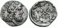 | Troezen BMC 98 | Achaean league, Troezen, Peloponnesus, AR hemidrachm. 175-168 BC. 14 mm, 2.27g. Laureate head of Zeus right / AX monogram, AM monogram above, Δ-I across field, trident below, all within wreath. BMC 98. | Text | ![]() |