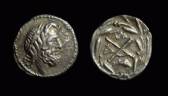 | Patrai SNG Cop 244 | Achaean League, Patras AR Hemiobol. Circa 175-168 BC. Laureate head of Zeus right / Monogram in wreath, ΛY above, A-Ρ, dolphin right below. Thompson 298. | Text | ![]() |